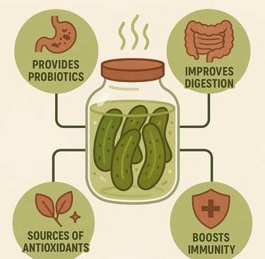 Fermented pickles (sauerkraut, kimchi) deliver beneficial bacteria that support gut health.